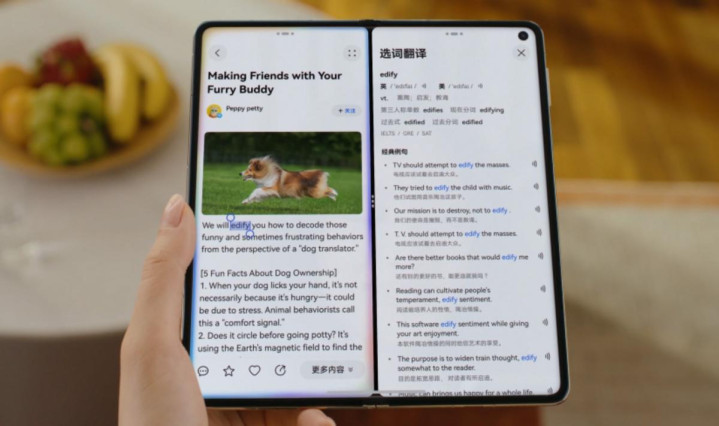 另外,为了进一步挖掘大屏优势,华为Mate X7还带来了更为丰富的功能体验。比如通过小艺分屏,用户可以左屏浏览文档,右屏让小艺随时为你答疑解惑;遇到难懂的外文材料,也可以唤出小艺为你实时翻译,中英文对照互不干扰。